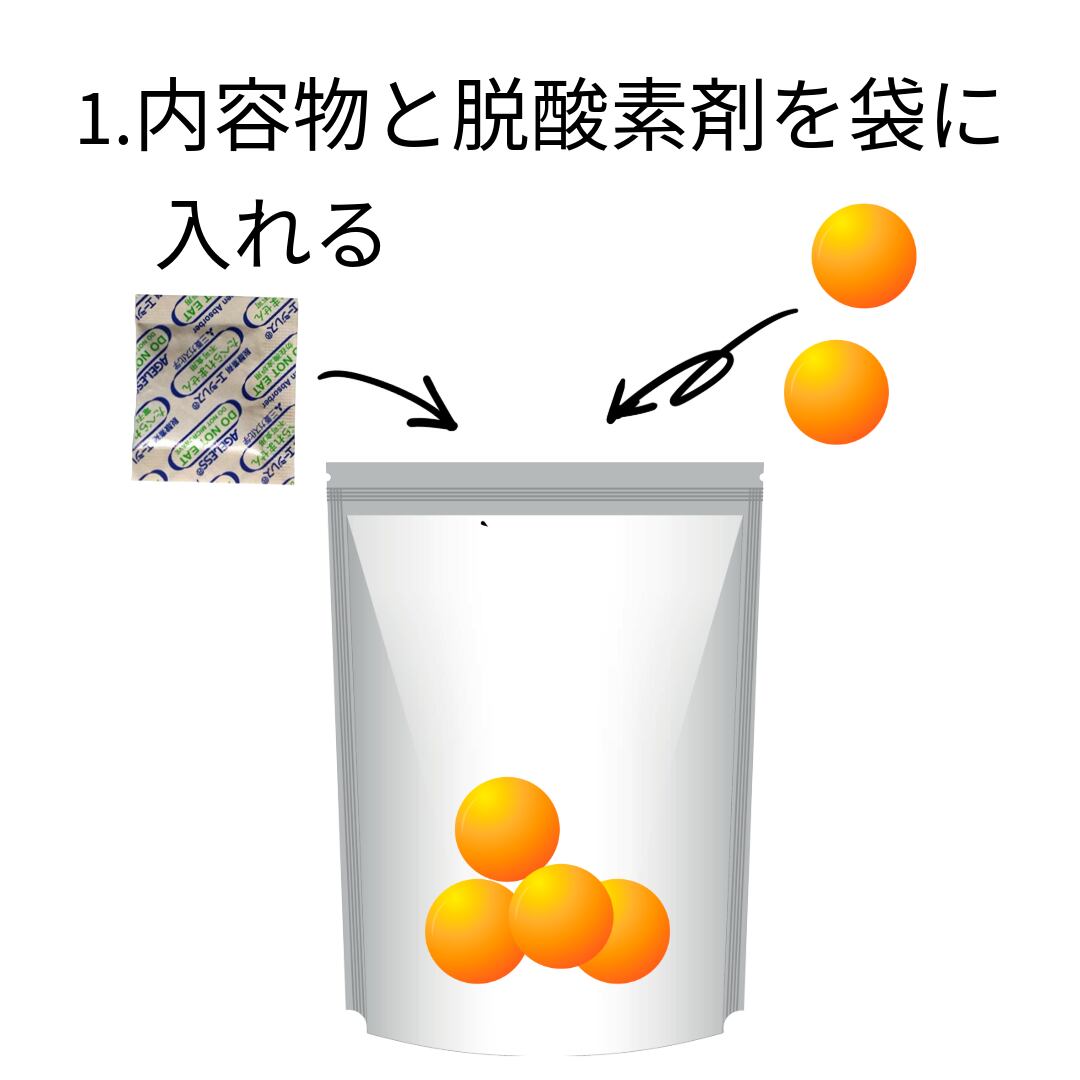 脱酸素剤エージレスは、包装容器内の酸素を吸収し、食品の酸化、カビの発生、変色を防止し、鮮度とおいしさを保ちます。